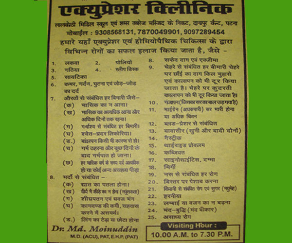 Dr.Md.Moinuddin Acupressure Clinic is an Acupuncture/Acupressure/Homeopath/Hijama clinic in Danapur, Patna (Bihar).